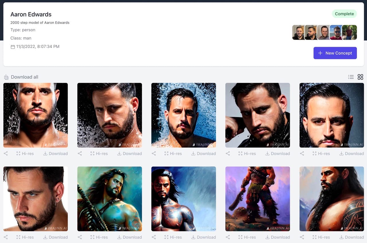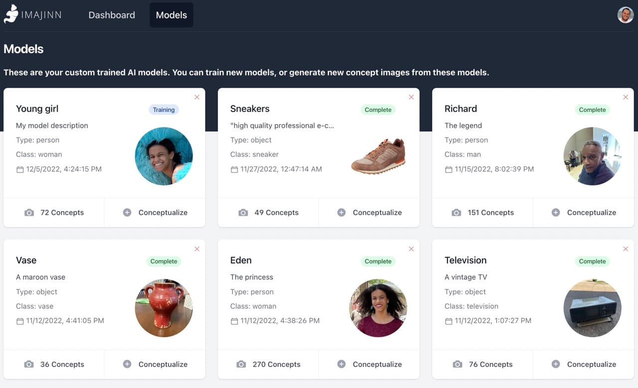 We do not own the training images you upload, the images you generate, or your trained model. You can delete that data at any time. We do not share your data with anyone, and we do not use it for any purpose other than to provide the Imajinn service. Please see our privacy policy for more details.